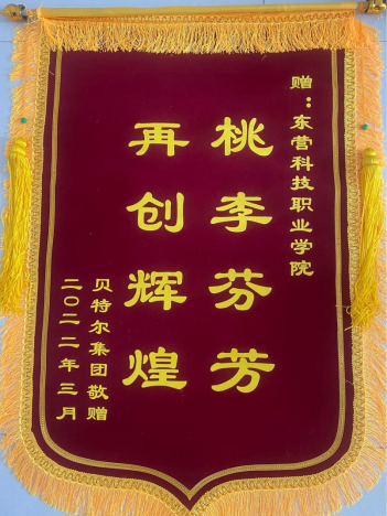 3月23日,广饶贝特尔控股集团副经理张杰莅临公司,并赠送“桃李芬芳 再创辉煌”锦旗,公司刘永峰董事长、安丰金经理和李平主任参加了此次活动。